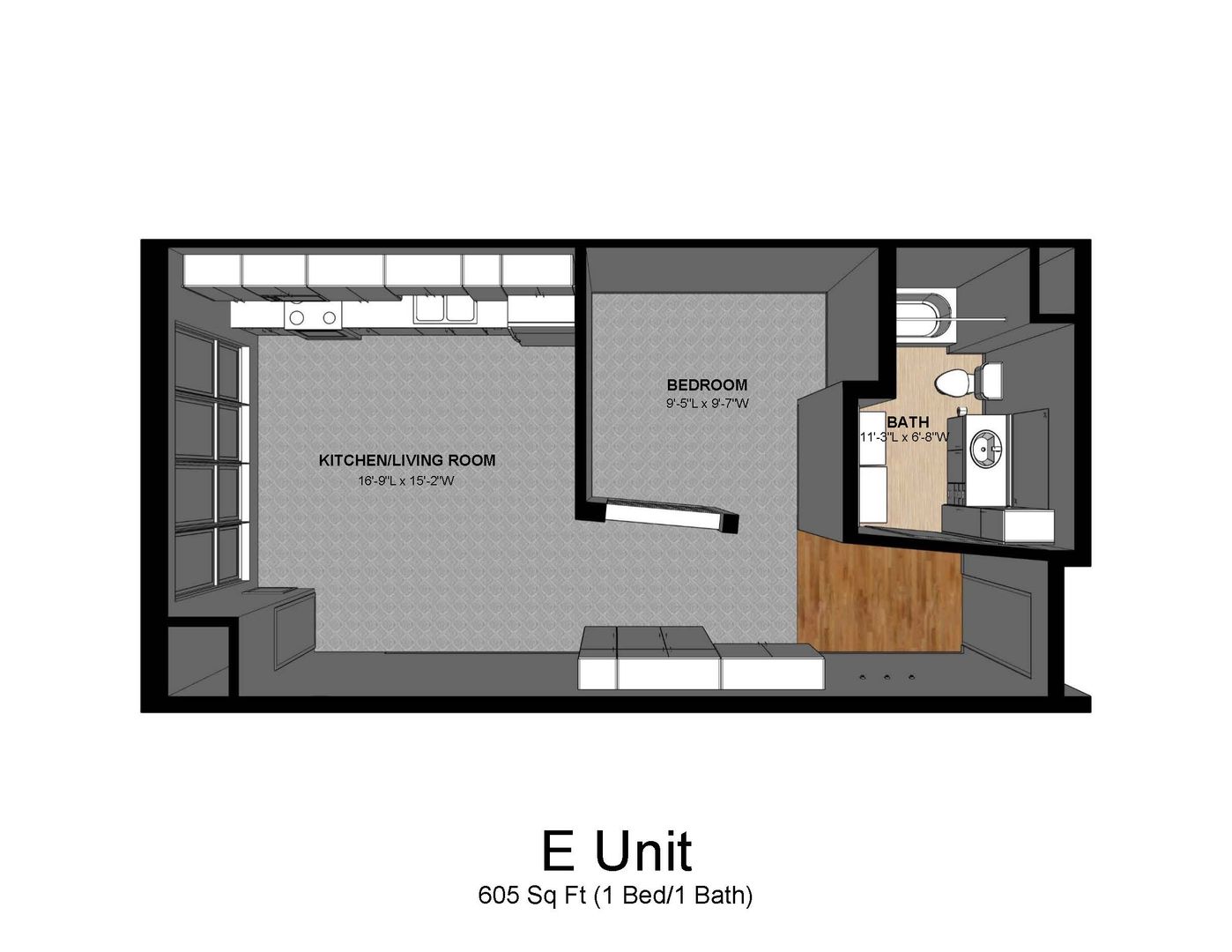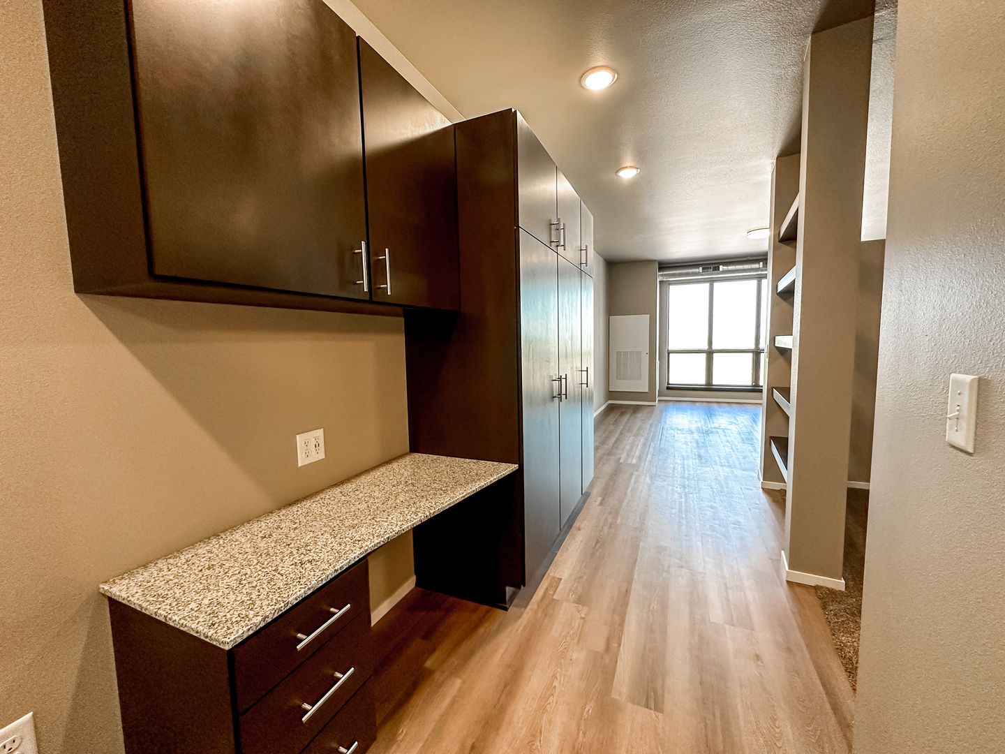 Upscale Studio/1 Bath Apartment. Granite countertops, LED lighting throughout, full size washer & dryer. Heated underground parking spaces, some with storage, available for extra monthly fee. Tenant pays electric (which includes heat) and internet/cable. Landlord pays water, sewer & garbage.